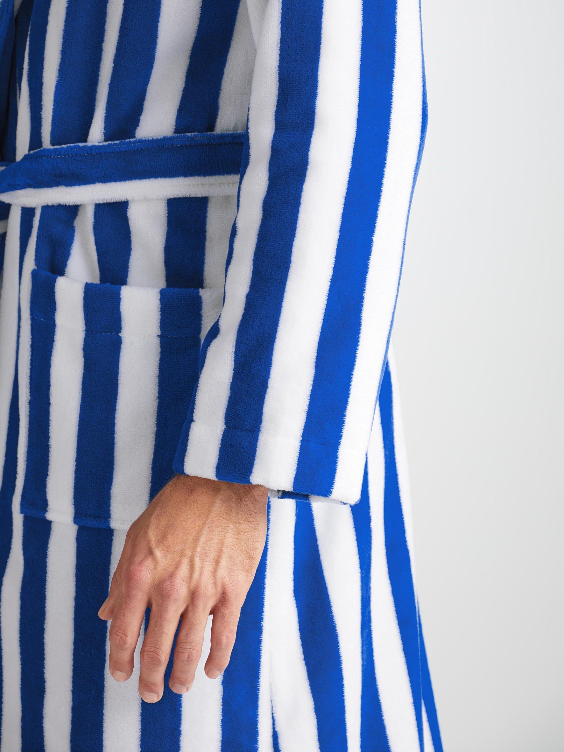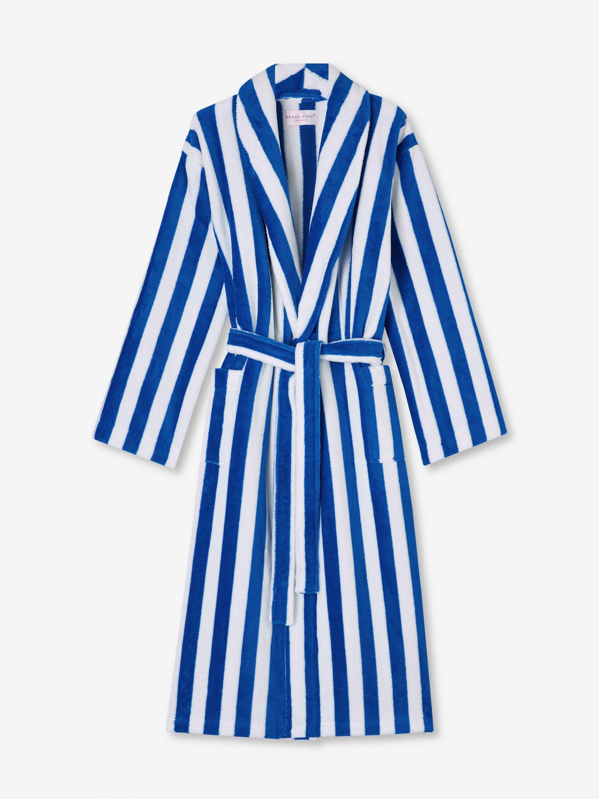 Our Aston bathrobe is a customer favourite, seen here with classic blue and white stripes, it features a classic shawl collar and two side pockets for practicality while around the house. It’s fastened with a fabric tie belt for the perfect fit.