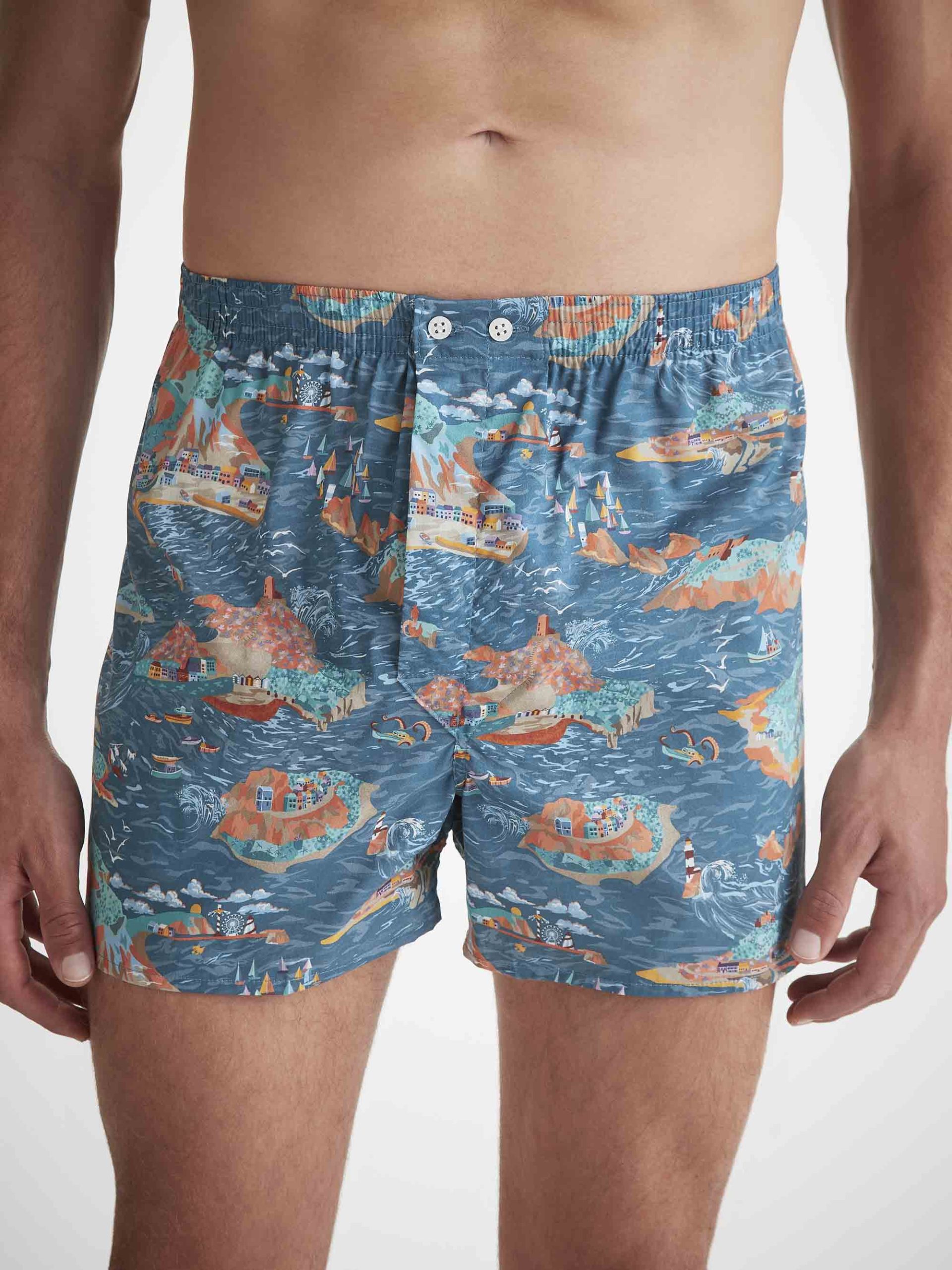 Our seasonal boxer shorts display a blue fisherman’s scenic print featuring coastlines and landmarks across the UK. From Dorset cliffs and Welsh lighthouses to Cornish harbours and beach huts in Bournemouth.