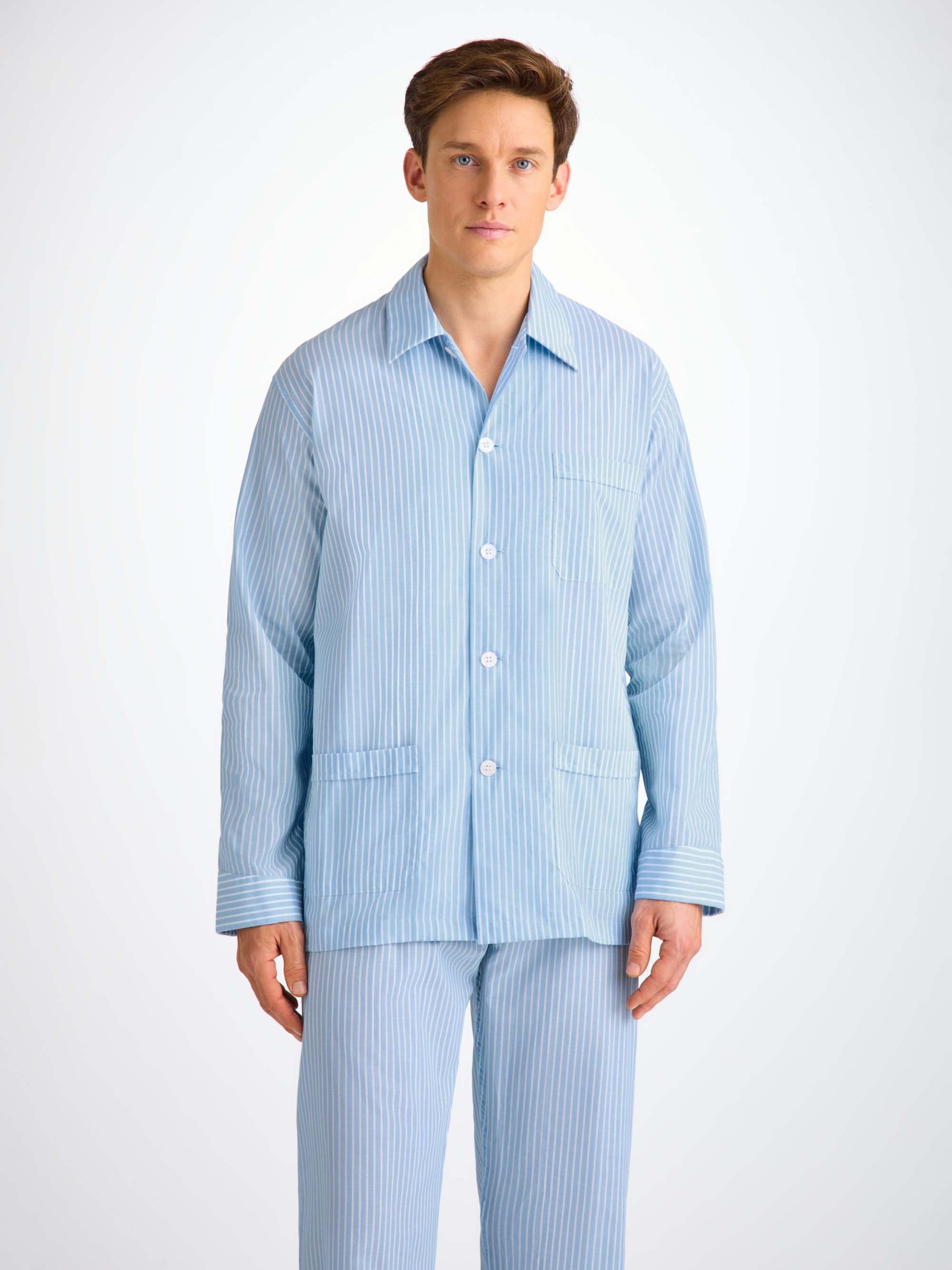 Our Amalfi cotton has been part of our brand since 1980 when Derek Rose embarked on a search for lightweight fabrics. It has truly passed the test of time. Wash and wear this pyjama set for years to come because this fabric lasts wonderfully well. Complete with a soft sky blue and white stripe.