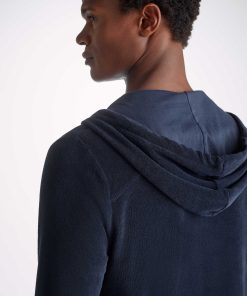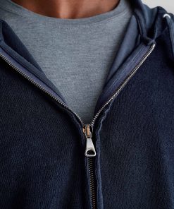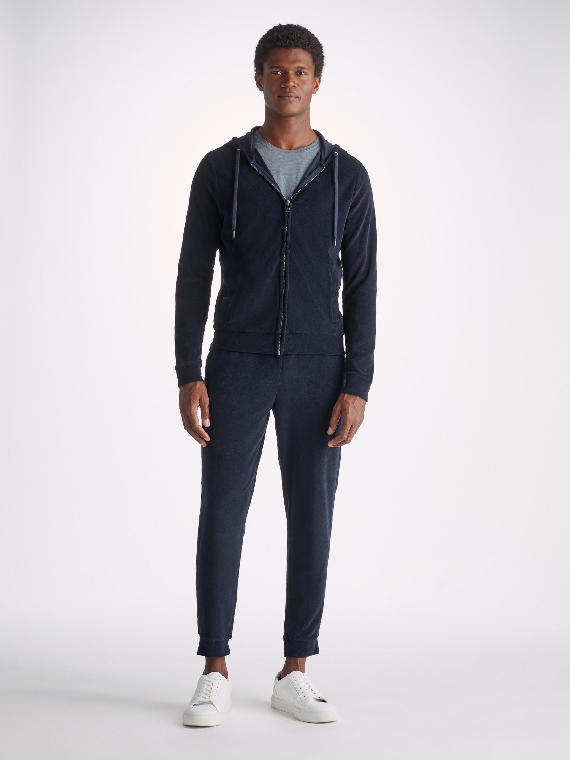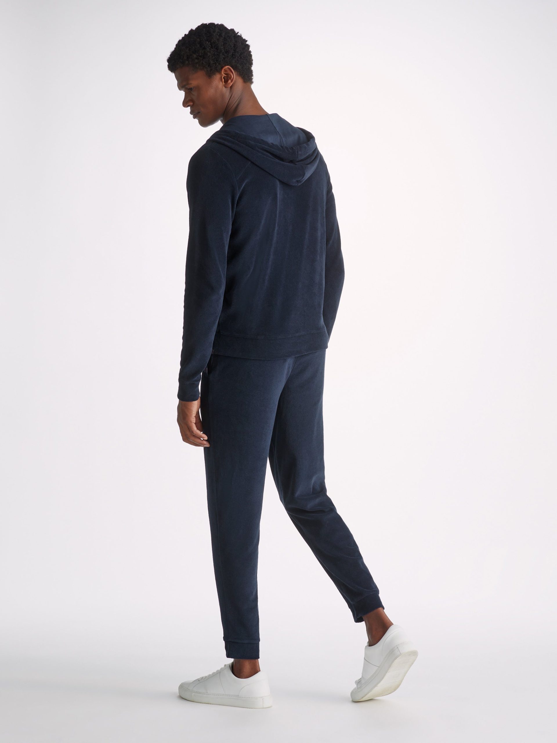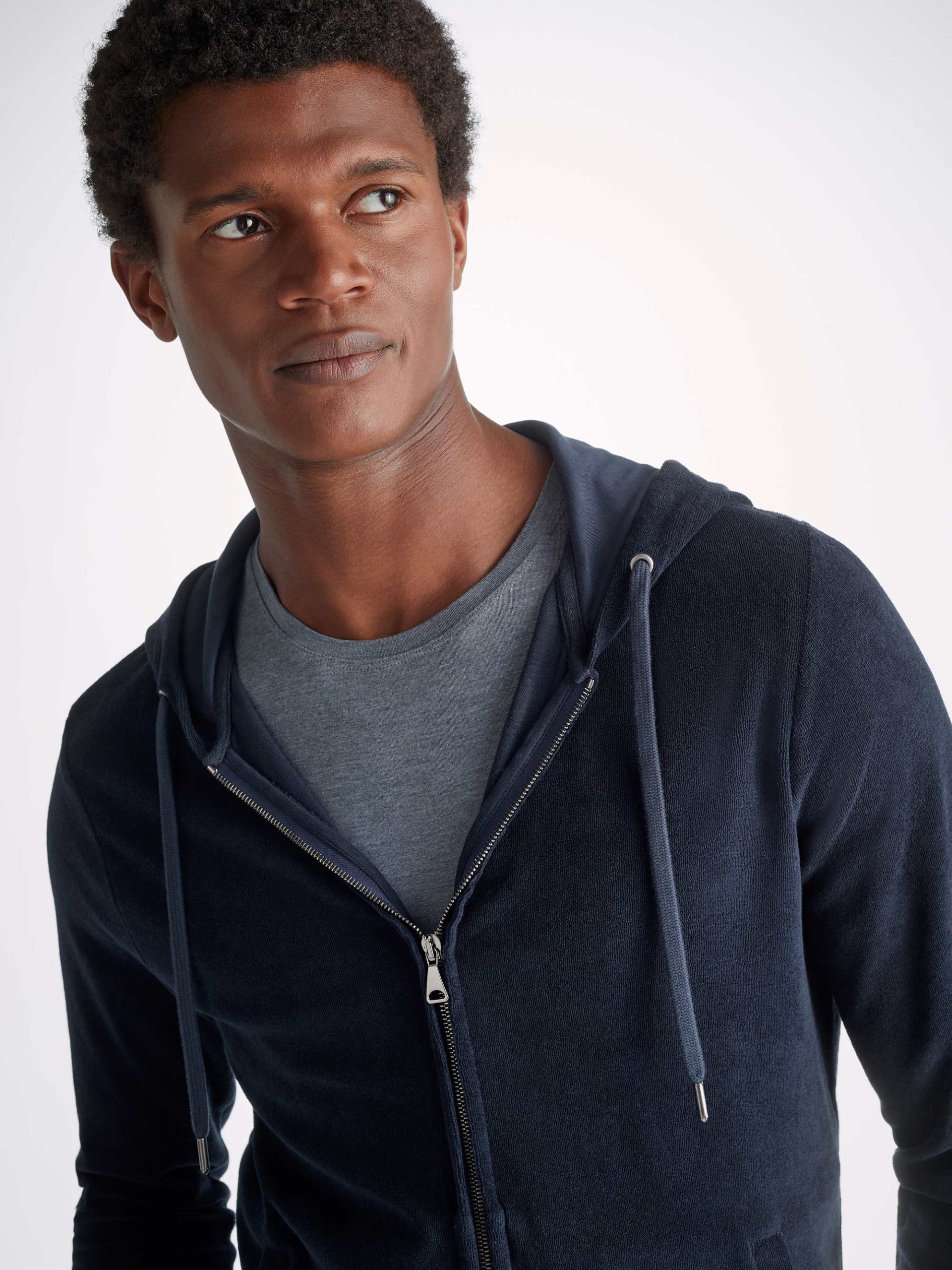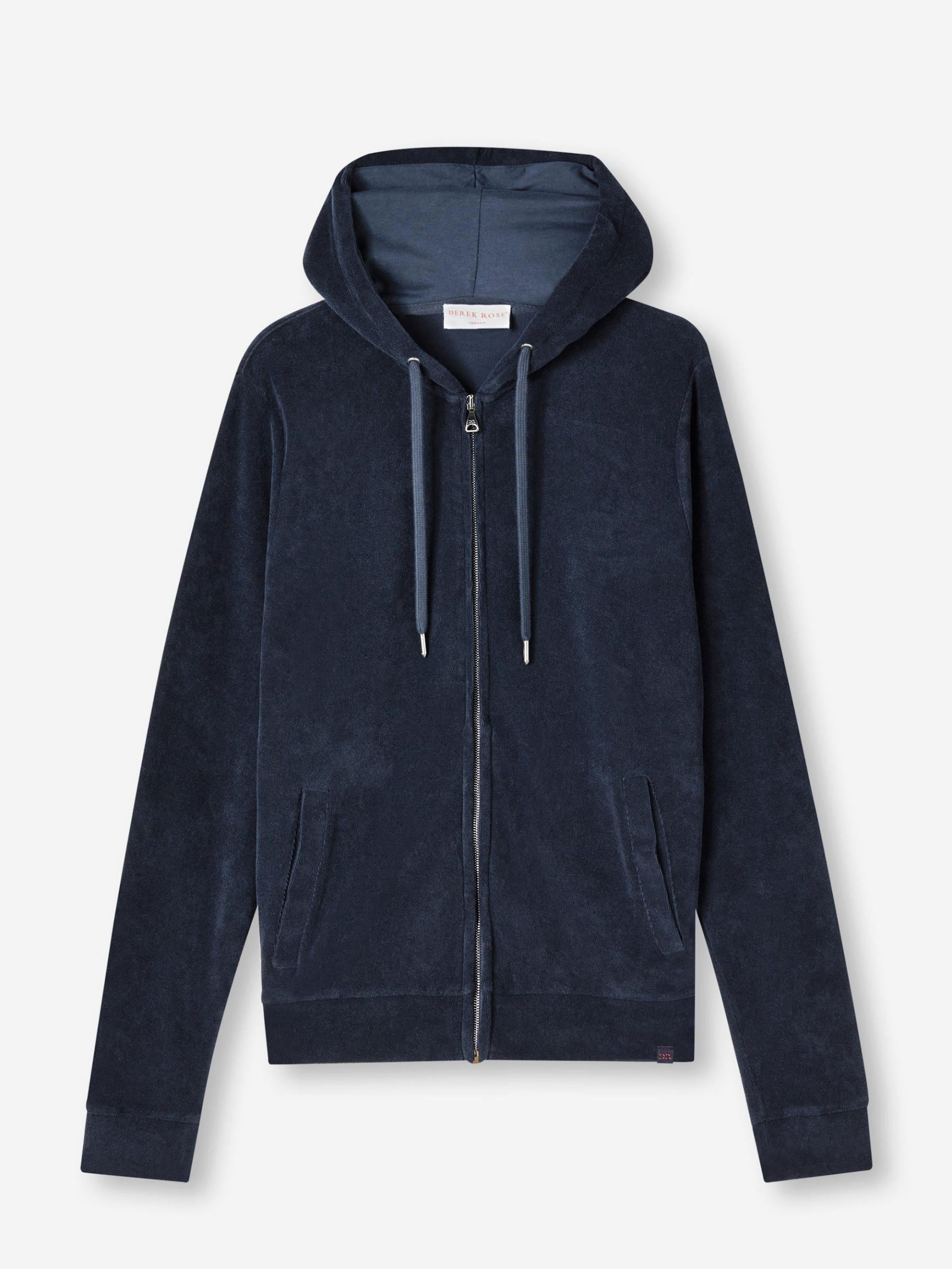 Made with high quality, towelling cotton for a truly luxurious handle, small innovative touches such as a curved back yoke, angled front pockets and self fabric cuffs elevate the Isaac navy hoodie into a wardrobe must-have.