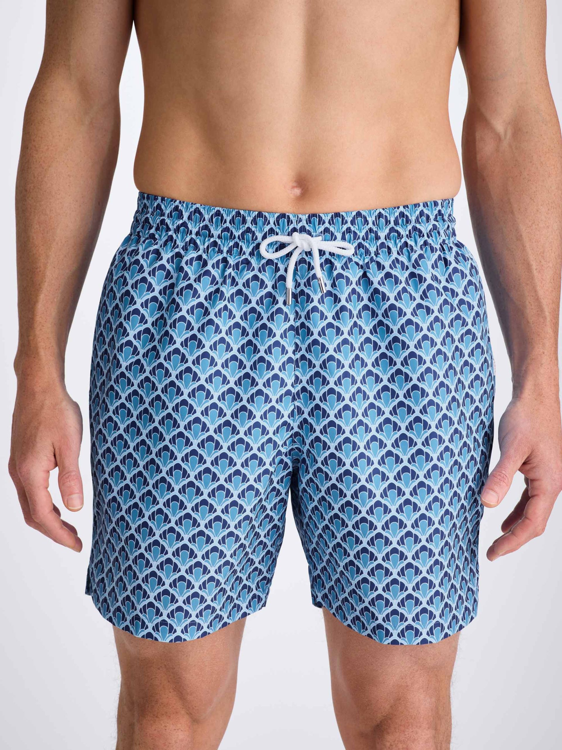 Designed for a relaxed look, our scalloped leaf design features a geometric, hand drawn stylised foliage in a mid blue tone. This classic style swimming trunk has a fully elasticated waistband and drawstring tie for the perfect fit. The braided drawstring ends are complemented with metal aglets for a luxe finish and the back of the swim shorts features cotton-stitched eyeletss for easy air and water drainage.
