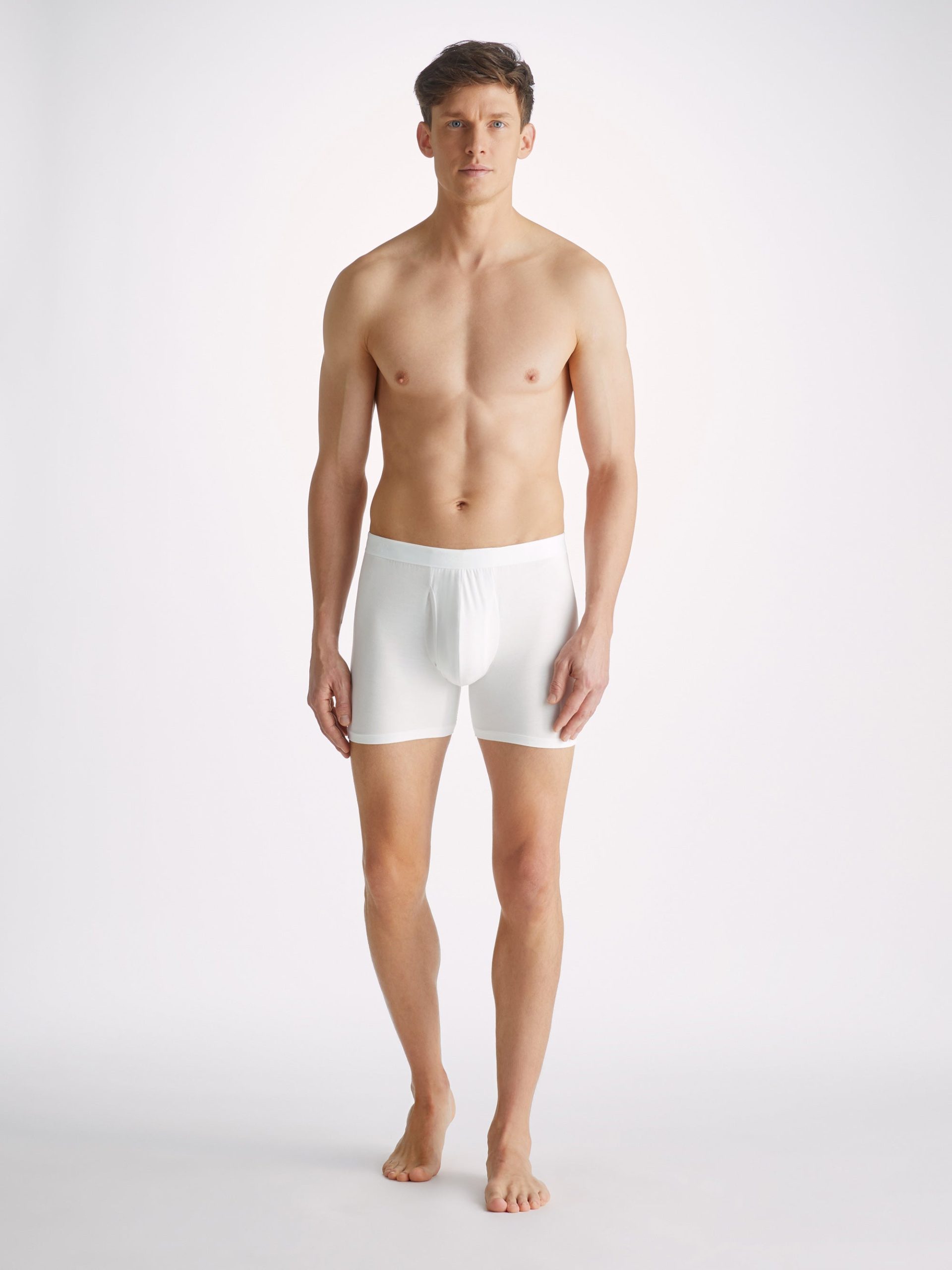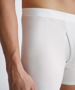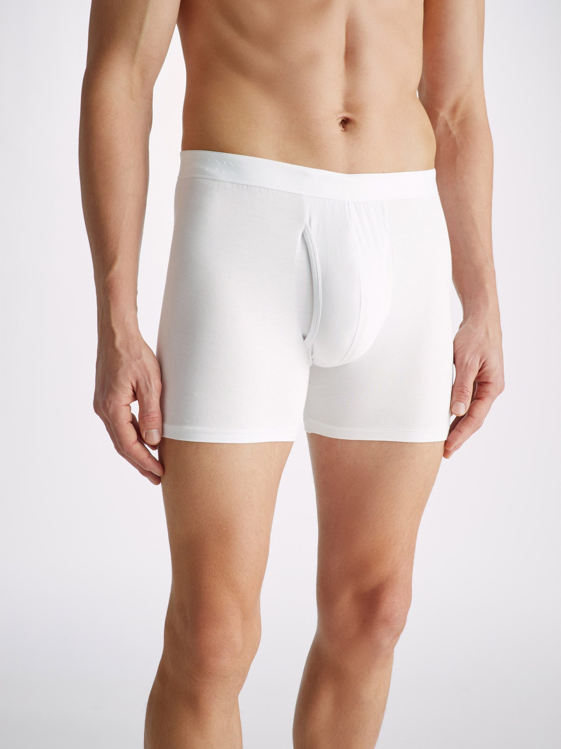 Our Alex trunks in white are cut for a streamlined, classic look with a fitted shape, classic open front and a longer leg. A fabric-covered waistband provides gentle skin contact.