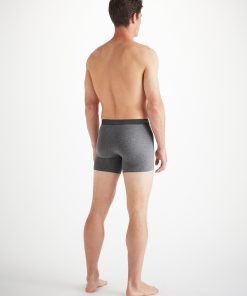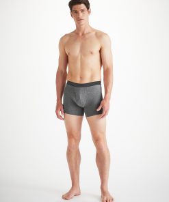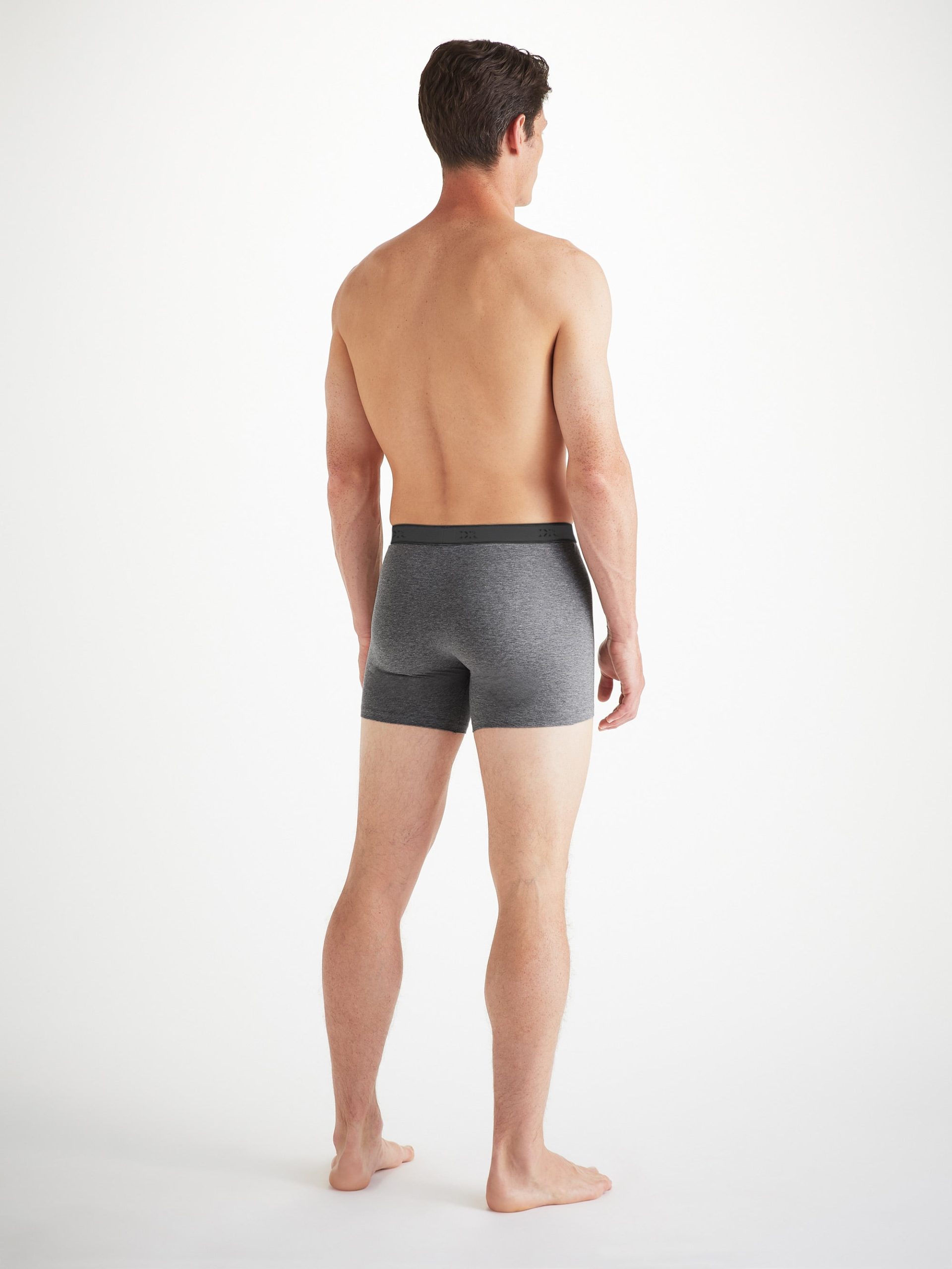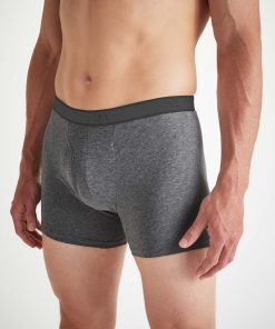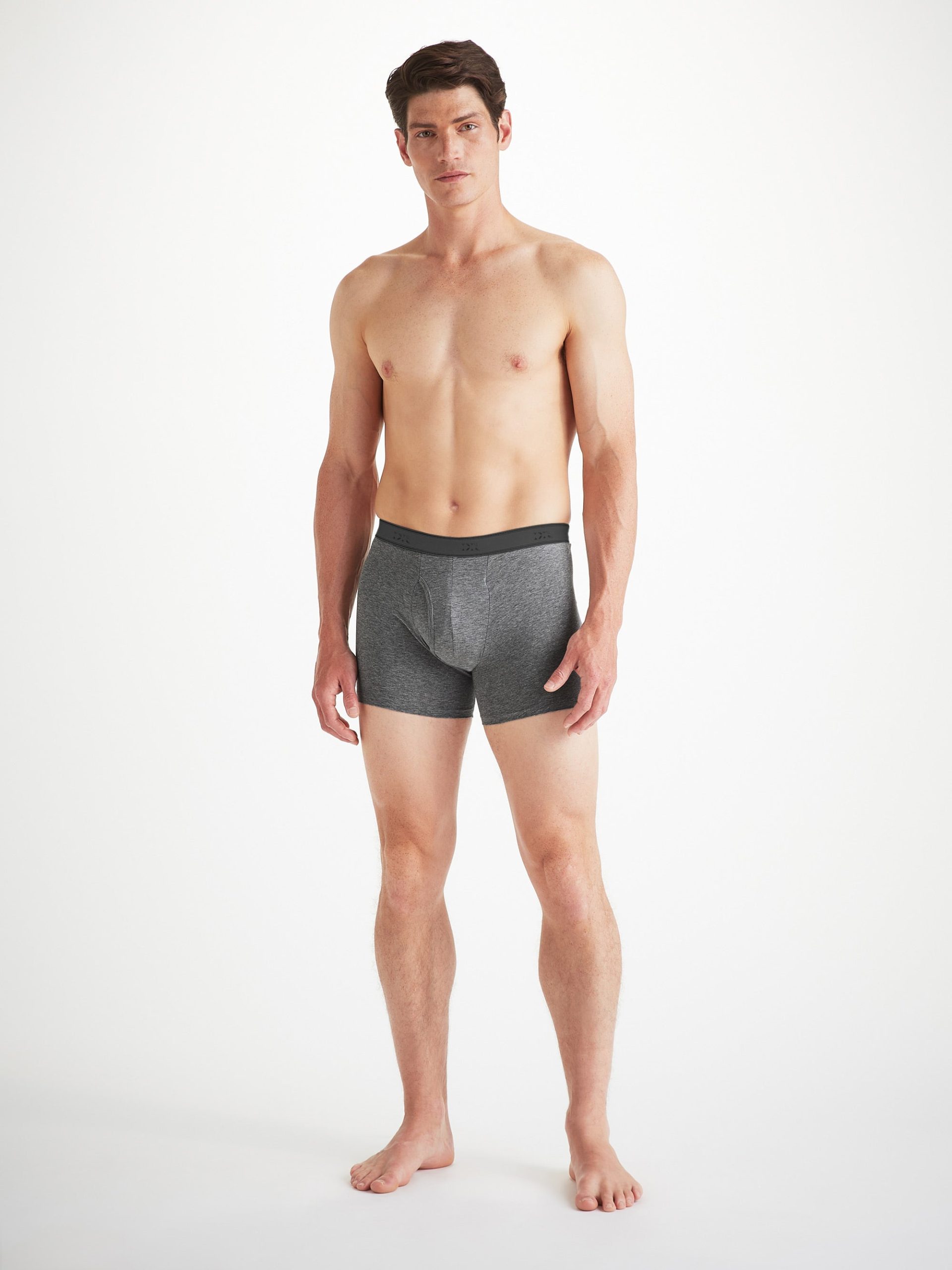 Our Jack trunks in charcoal are cut for a streamlined, classic look with a fitted shape, classic open front and a longer leg. A fabric-covered waistband provides gentle skin contact.