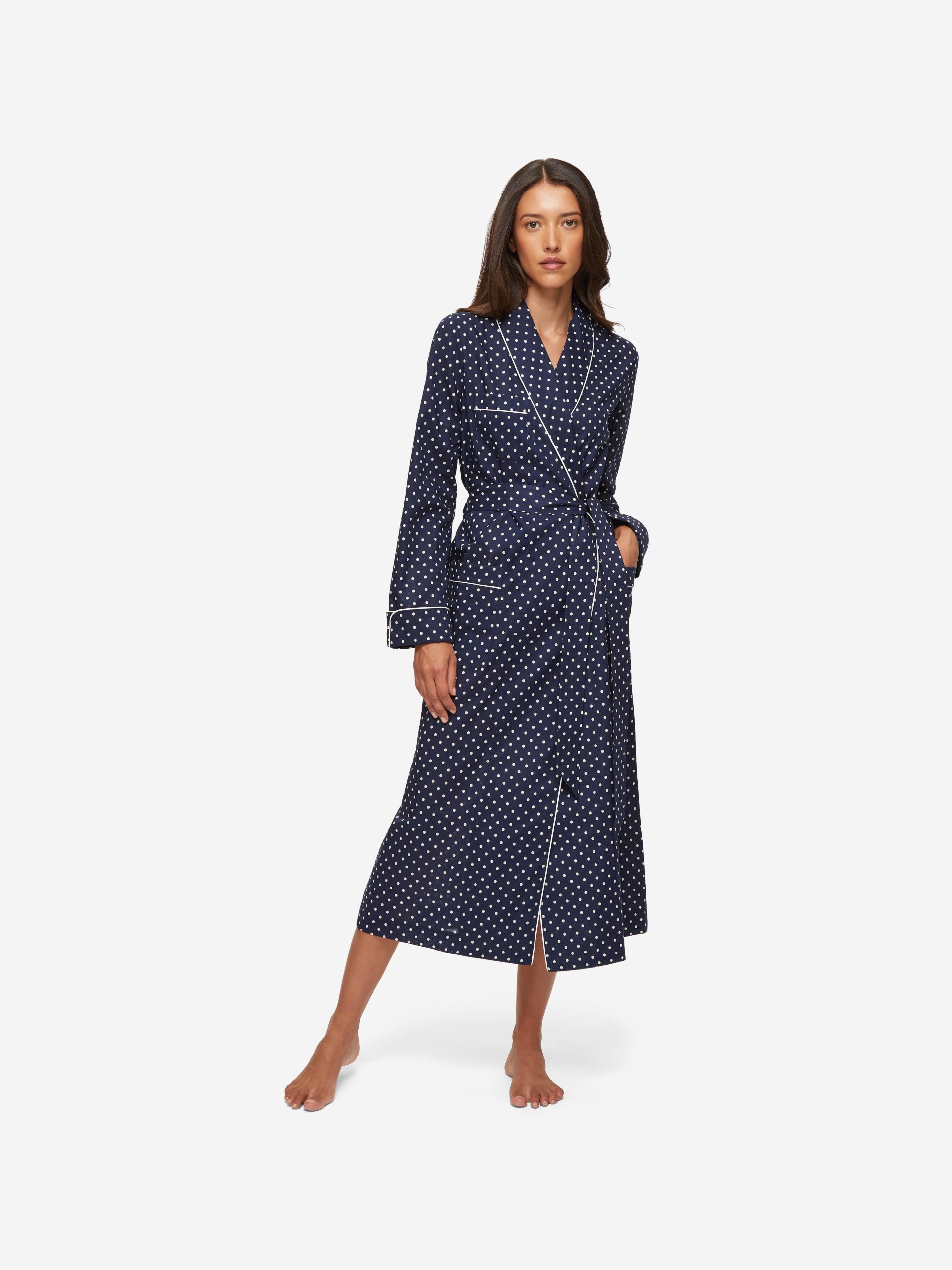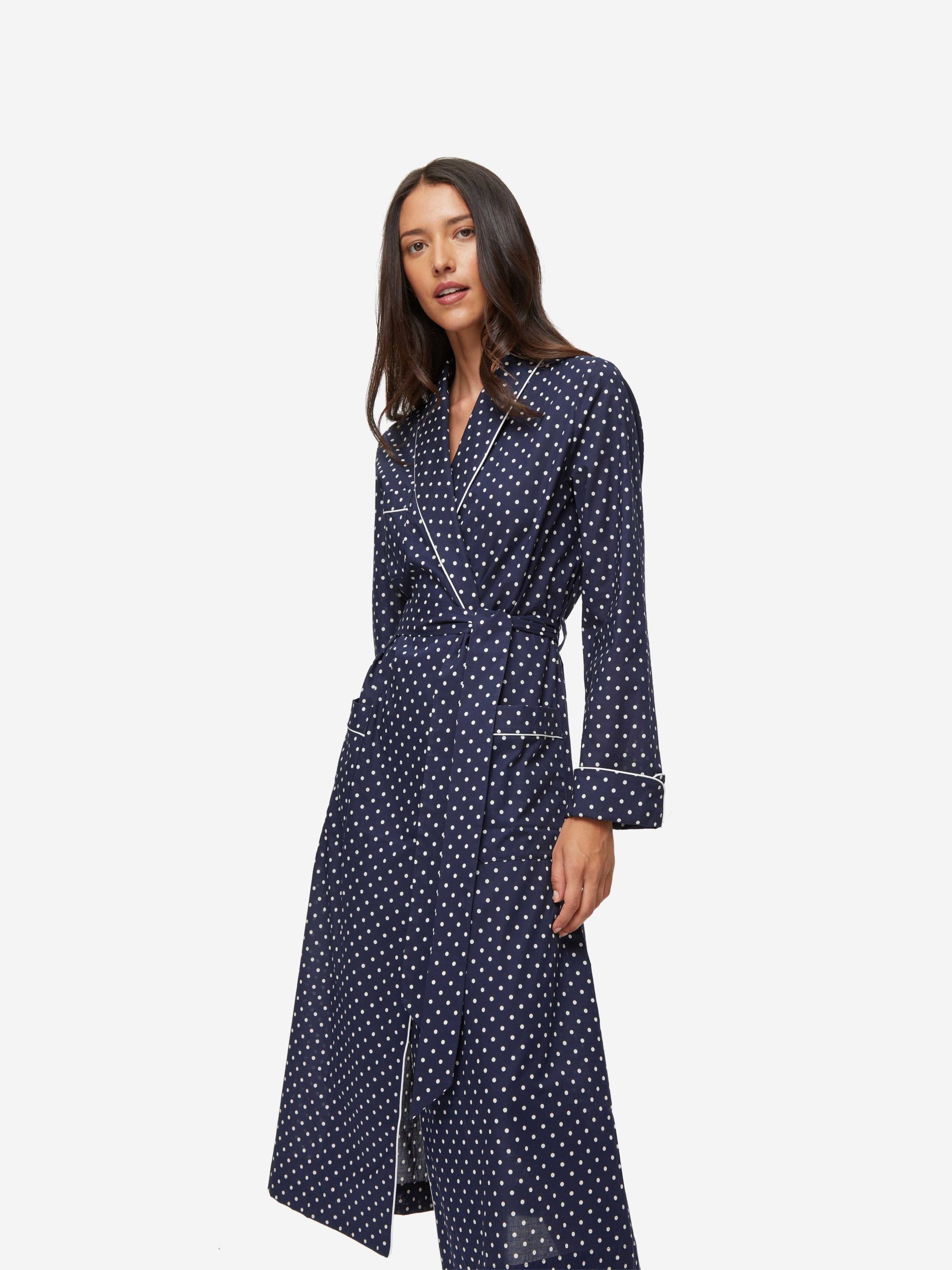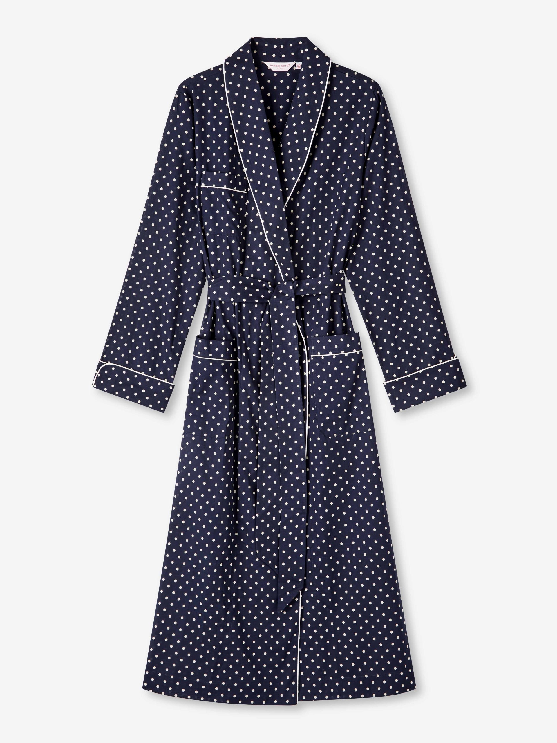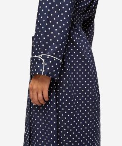 Our cotton batiste has become a firm favourite of our customers, thanks to its breathability, lightweight properties and luxuriously soft feel. With its stylish polka dot print this navy gown is the perfect choice for breakfast at home or for weekends away with loved ones.