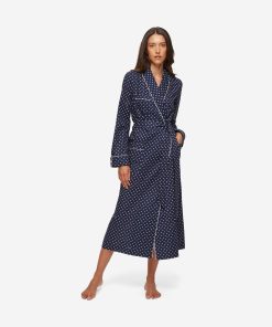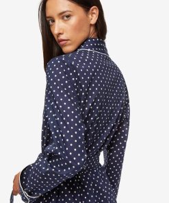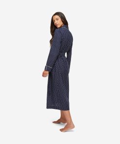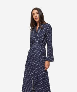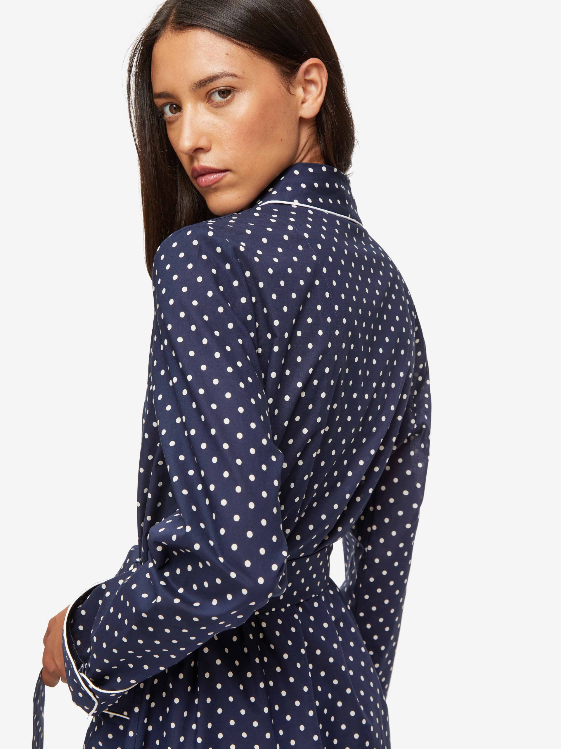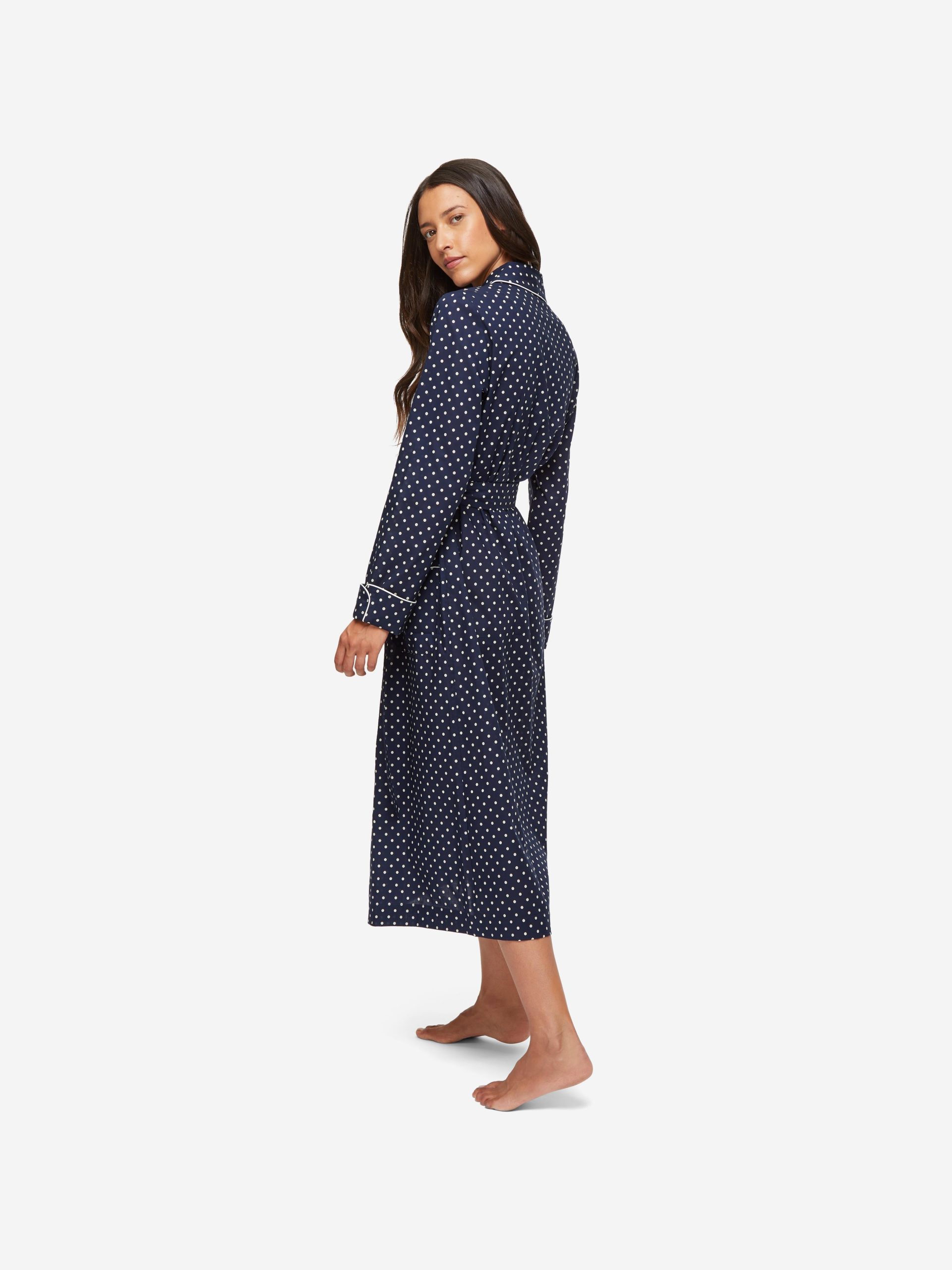 Our cotton batiste has become a firm favourite of our customers, thanks to its breathability, lightweight properties and luxuriously soft feel. With its stylish polka dot print this navy gown is the perfect choice for breakfast at home or for weekends away with loved ones.