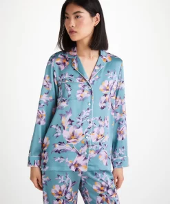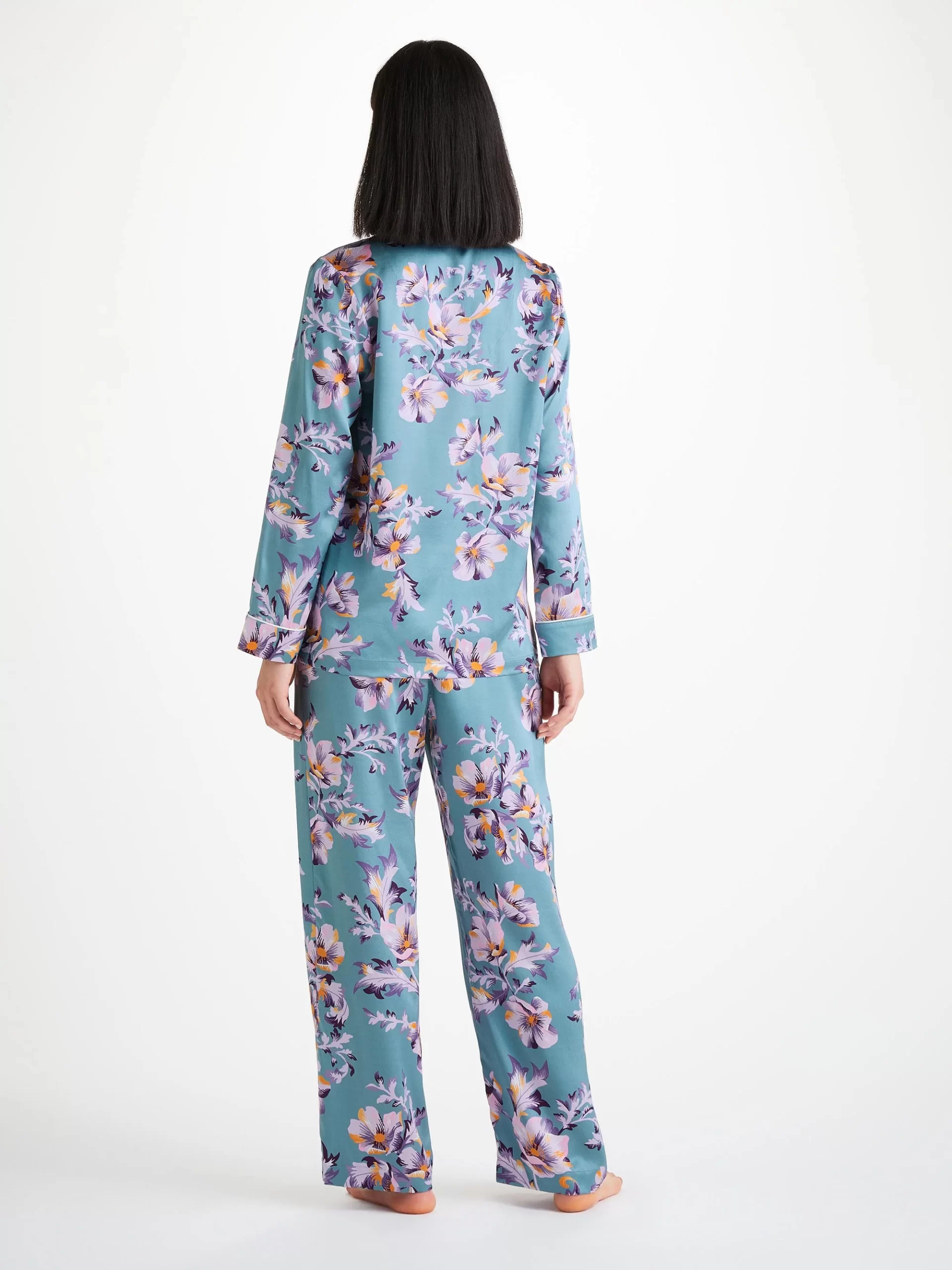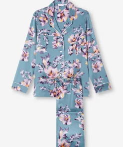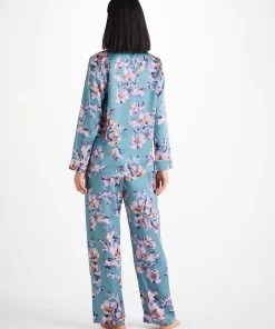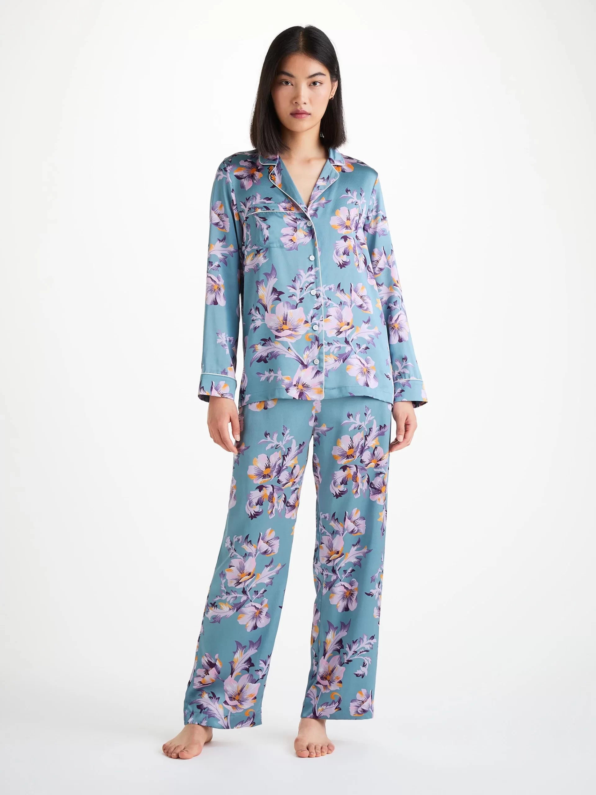 DEREK ROSE Women’s Pajamas Silk Satin Blue Wildflower Pattern Mid Blue | WOMENS- Gifts for Her
